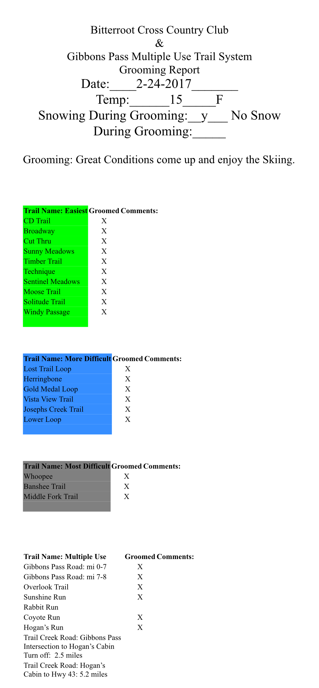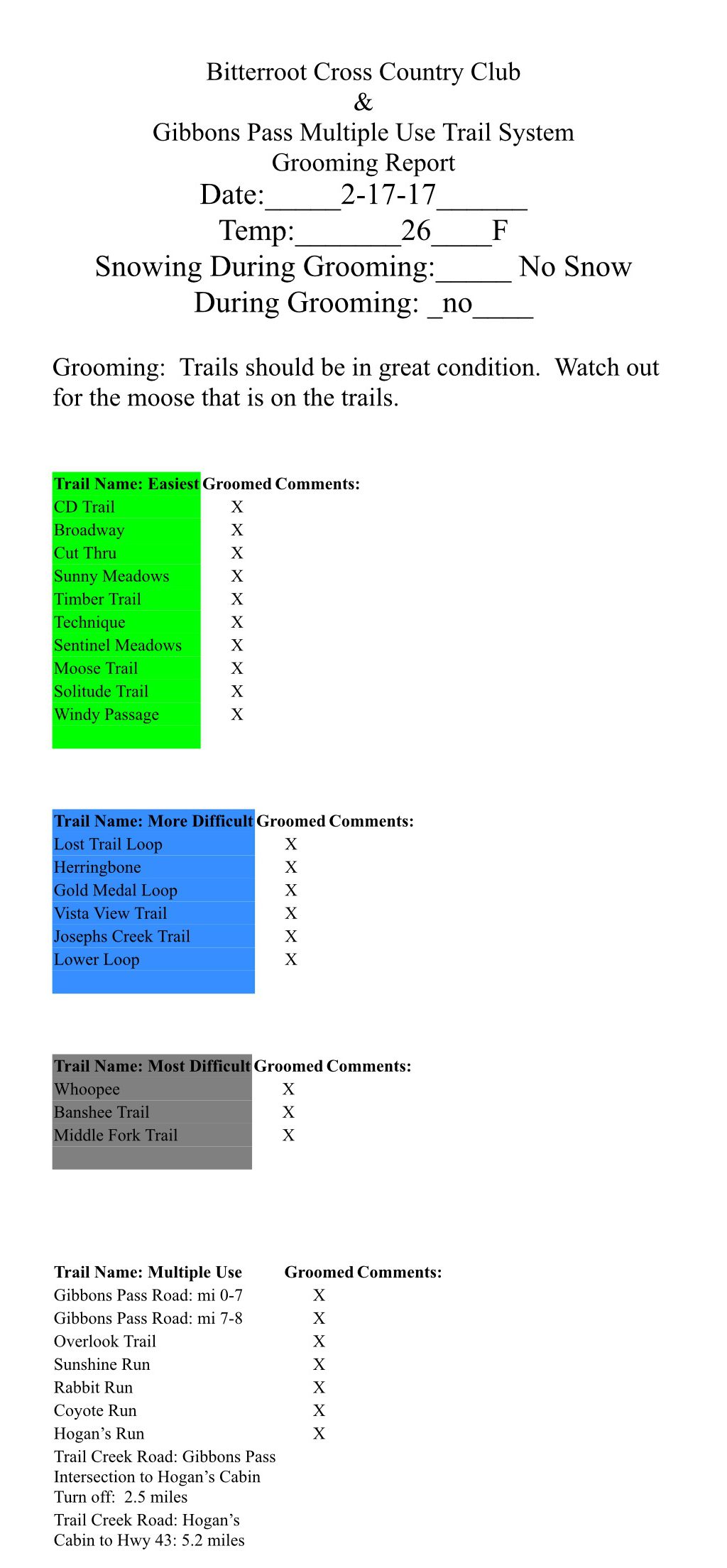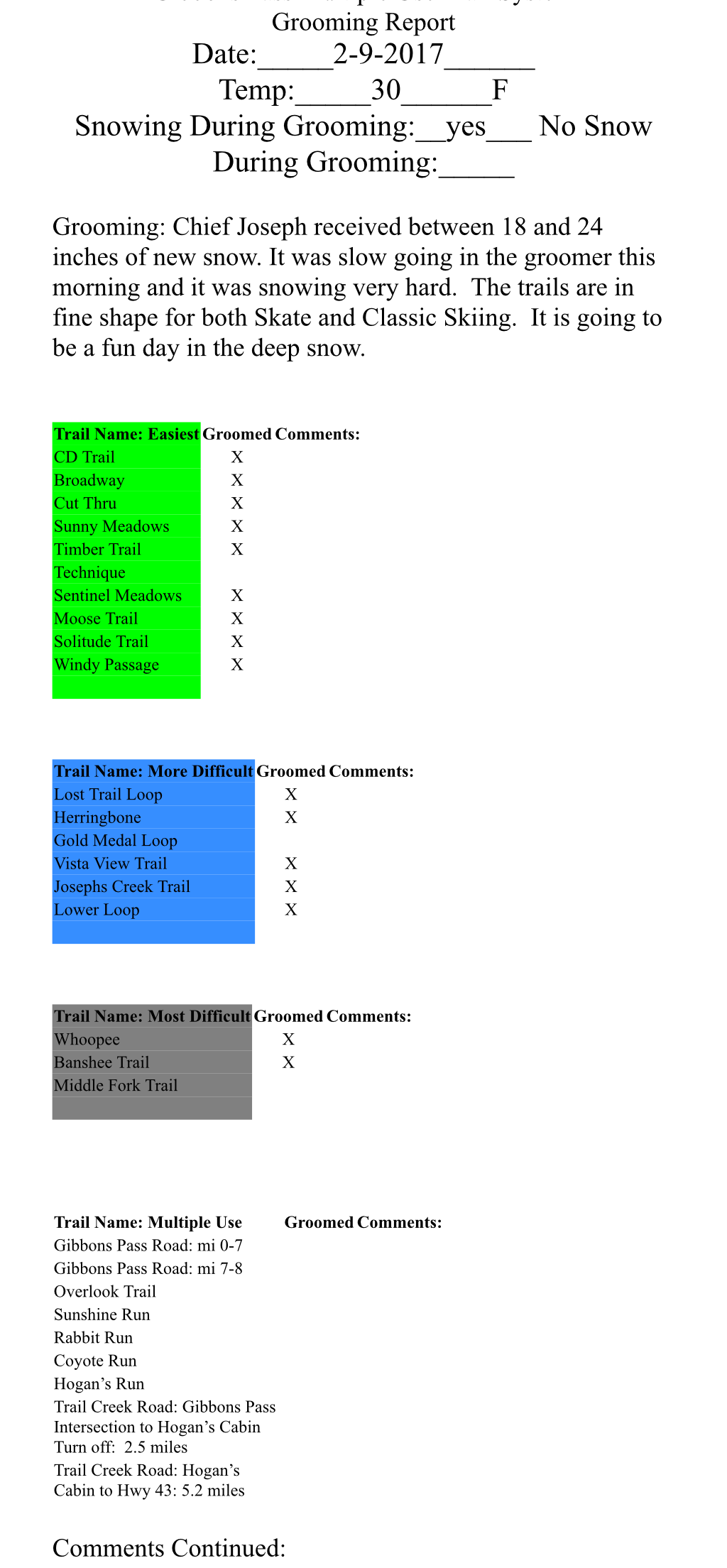 Most of the trails at Chief Joseph Pass were groomed Tuesday. Since then it has snowed 4 inches of wet heavy snow. Tuesdays grooming setup like concrete, but anything not groomed is totally unsupportable, and because of the new snow it has hard to tell the difference until you sink. Temperatures are forecasted to stay above freezing until late Friday night.