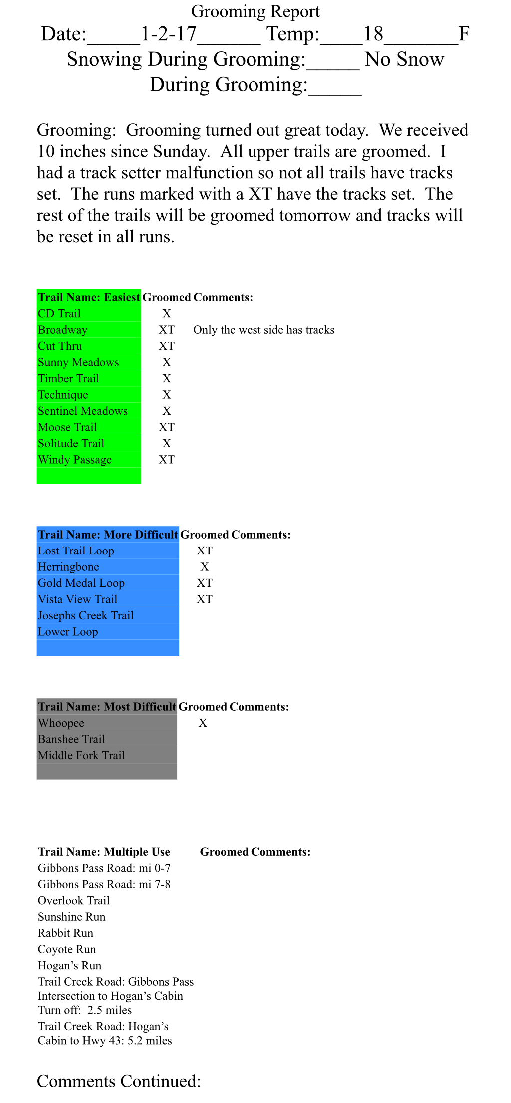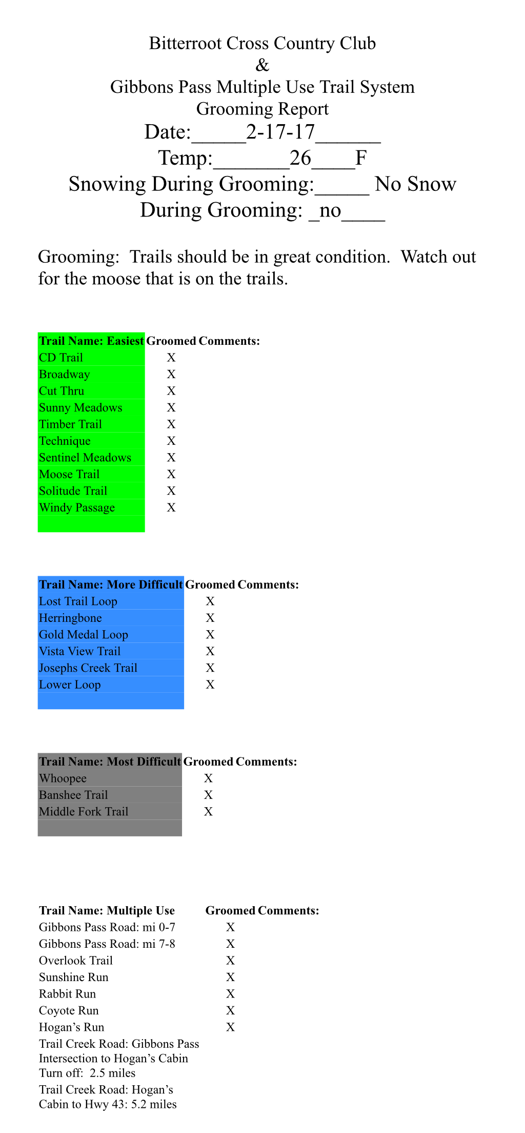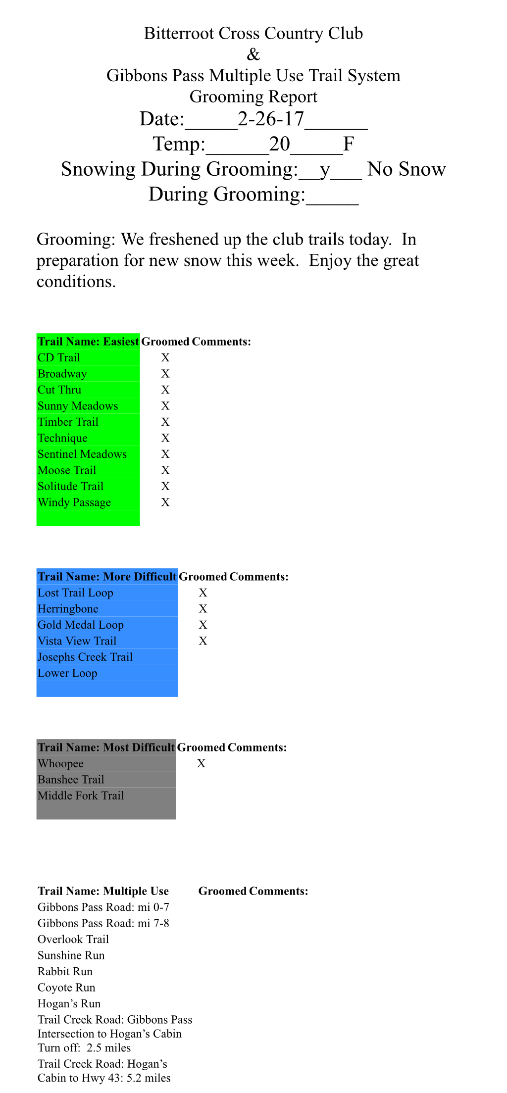Most of the trails at Chief Joseph Pass were groomed Tuesday. Since then it has snowed 4 inches of wet heavy snow. Tuesdays grooming setup like concrete, but anything not groomed is totally unsupportable, and because of the new snow it has hard to tell the difference until you sink. Temperatures are forecasted to stay above freezing until late Friday night.