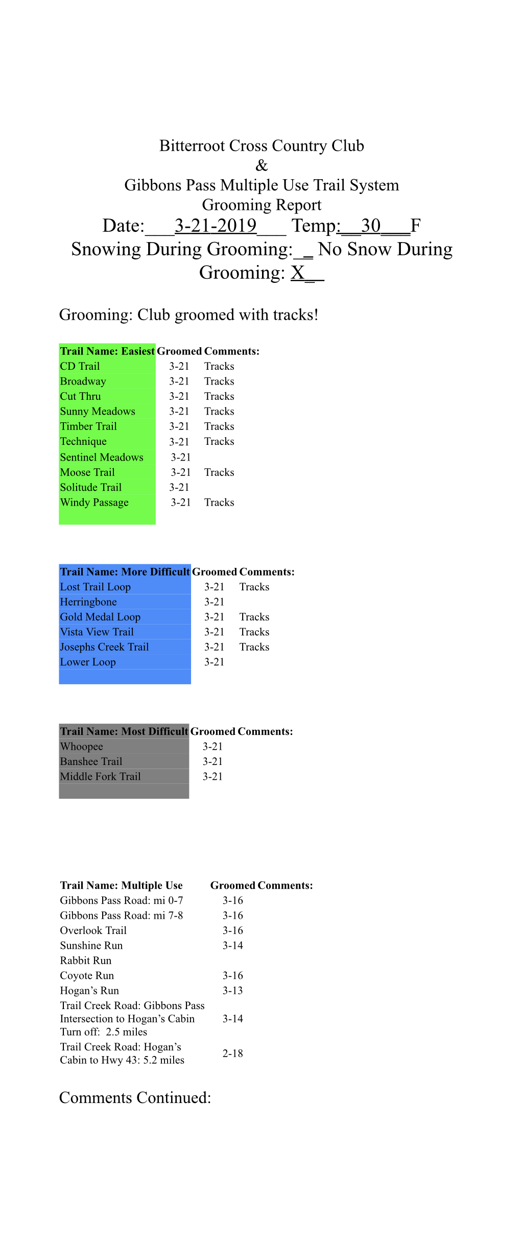 Most of the trails at Chief Joseph Pass were groomed Tuesday. Since then it has snowed 4 inches of wet heavy snow. Tuesdays grooming setup like concrete, but anything not groomed is totally unsupportable, and because of the new snow it has hard to tell the difference until you sink. Temperatures are forecasted to stay above freezing until late Friday night.
