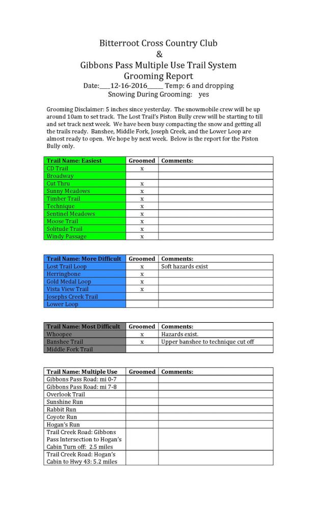 Final grooming report. “Really cold up there”! All upper trails have been compacted with the Pisten Bully and gone over many passes with the compaction/leveler drags. Still too thin of a snow cover to set tracks, we hit quite a few stumps and logs today just under the surface.