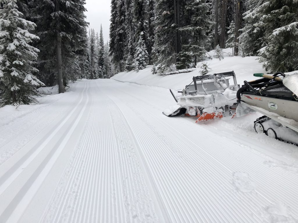 Our volunteer snowmobile grooming crew was out today and groomed all of the ski trails. This was the first time Middle Fork, Banshee, and Whoopee where groomed this year, they are still very soft and not recommended for skiing. This was the second time Joseph Creek has been groomed, it should be firm enough to ski, but it’s still a little rough, and does not have tracks set.