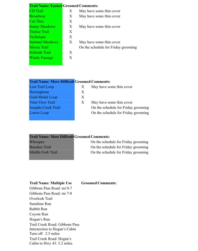 12 to 16 inches of fresh snow fell over the last few days. The Piston Bully has been out on the trails reshaping the tracks and widening the grooming floor. Very little track setting was done today so it would be a great day for skaters. Tracks will be set Friday. More trails will be groomed through out the weekend.