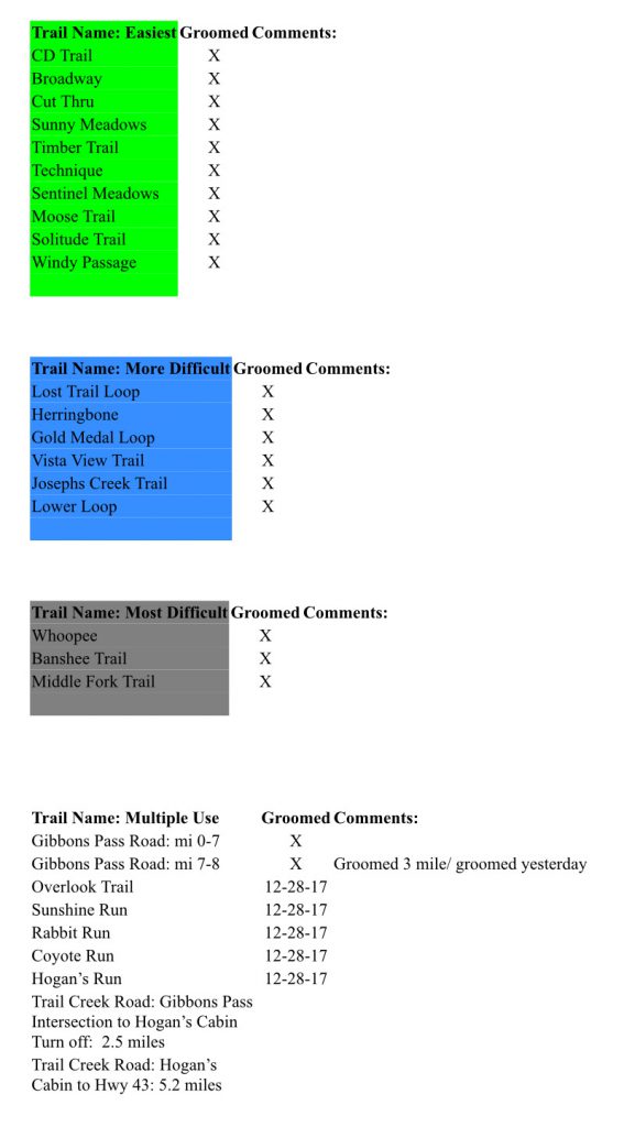 The snow has not stopped falling. Another 10 inches fell overnight and it has been snowing heavily since this morning. All trails were groomed yesterday. The Piston Bully got an 11am start today do to some maintenance. Our intent is to groom everything again today and again in the morning. The snow that has come in has been warm and the grooming will be slow. Happy skiing.