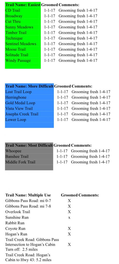 Grooming: All ski trails were groomed Jan 1 2017. The Piston Bully will be operating during the days 1-4-17 and 1-5-17. Please give the operator a wave and move to one side of the trail. NOTE: The report will change a little in the next few days to reflect the trails that have tracks set in them. We hope this will help keep people informed of changes in the grooming.