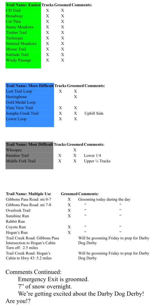 Grooming Report – 1/12/2018 7″ of new snow overnight. Most trails groomed with track set this morning.