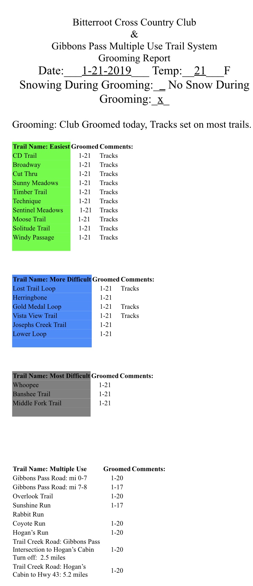 Chief Joseph Pass 1/21/19 All ski trails at Chief Joseph Pass were groomed today, with tracks on most.