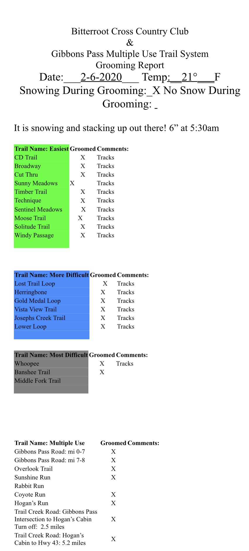 Today’s report from Chief Joseph Pass. Most trails groomed, but it’s snowing hard. If you want to skate get up there early, but it should be great conditions for classic skiing and touring all day.