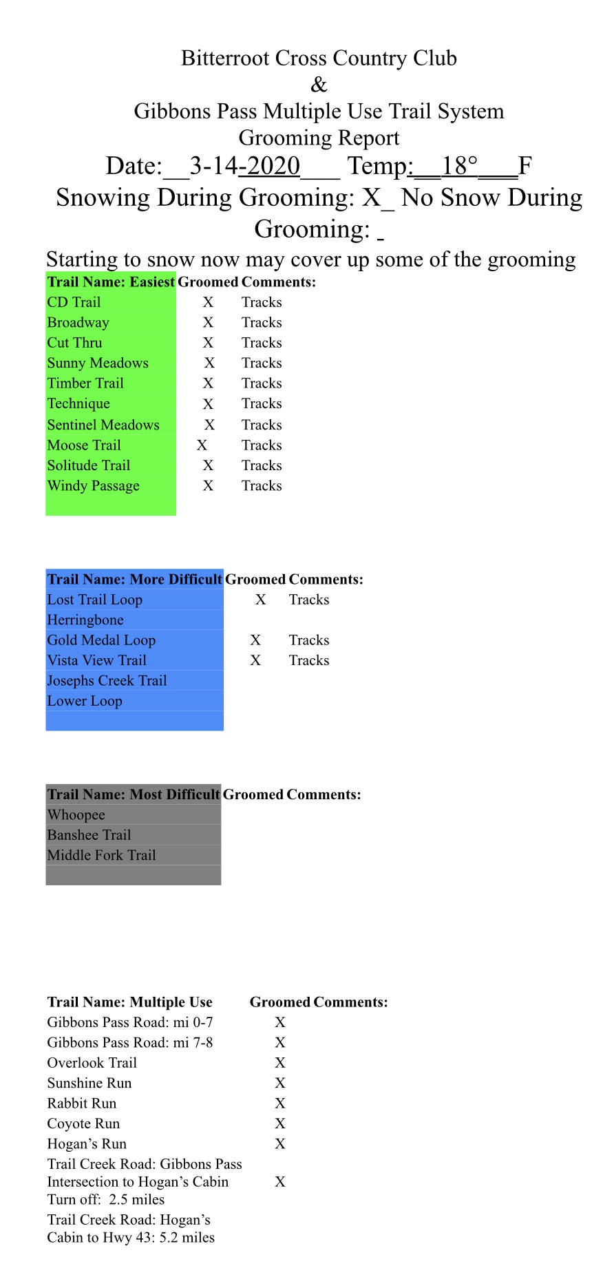 EToday’s report from Chief Joseph Pass: All the multi use trails, and most of the ski trails were groomed, but at 6 am it’s starting to snow, so if you want to see that corduroy get out there early.