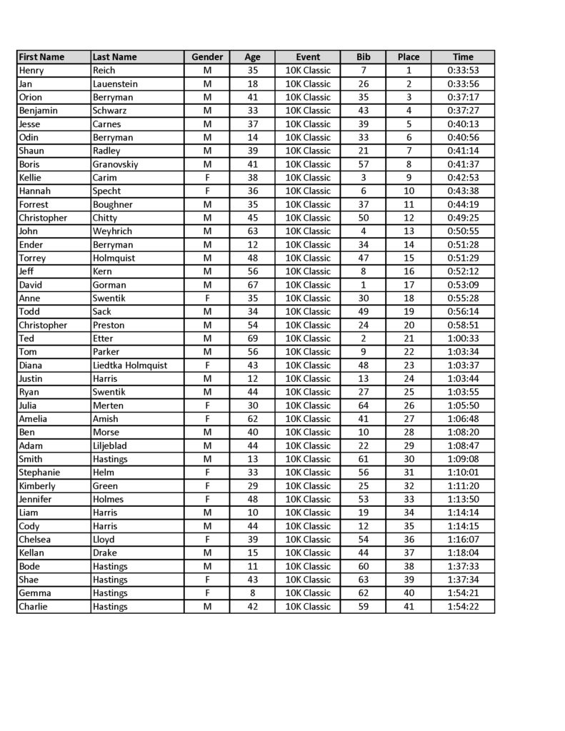 Here are the results for the Rust Buster. Thanks to everyone who came out to race and watch. Thanks to Lost Trail Ski Area and ski club chief groomer Tony Neaves for the excellent trail grooming, and a big thank you to the Beaverhead Deerlodge National Forest for working with us to make this happen.