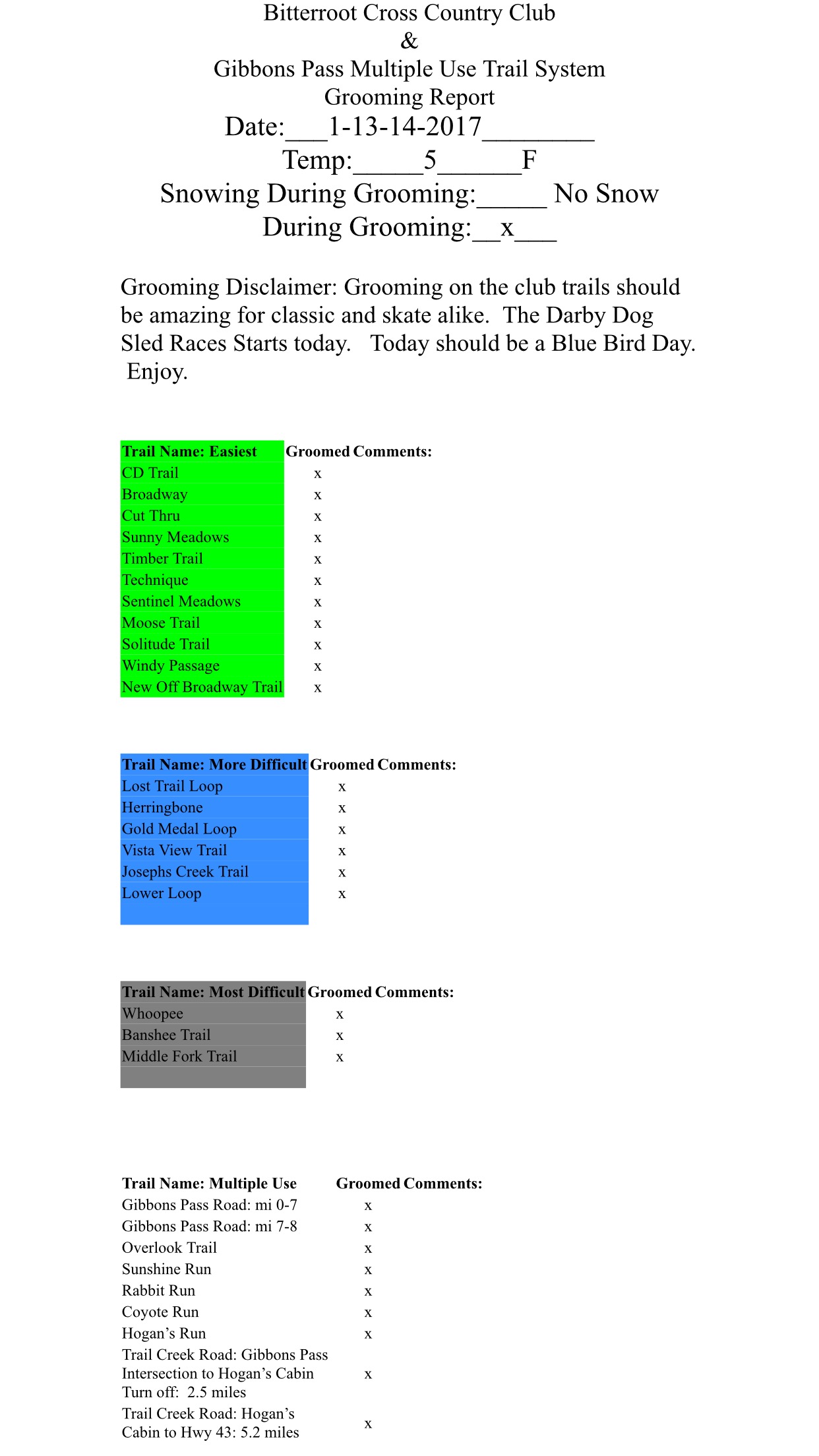 Grooming Disclaimer: The trails have really shaped up today. All Trails in the Club will have nice corduroy and perfectly set tracks for your enjoyment. Skiing should be great for both skate and classic. Come enjoy the warmer temps. To keep up with the snow Lost Trail Ski Area is double shifting the Piston Bully this weekend so keep you eye out for safety. Trails Groomed between 4 am and 9am are marked with an am the second shift is marked with and X. We will get to the Multiple Use Trails this after noon and tomorrow.