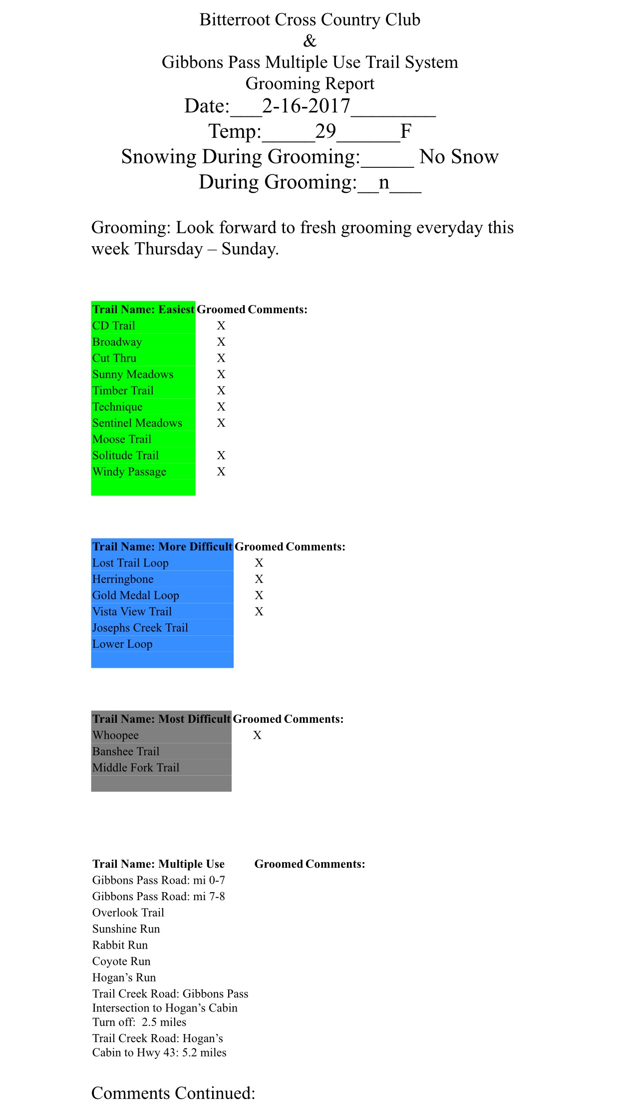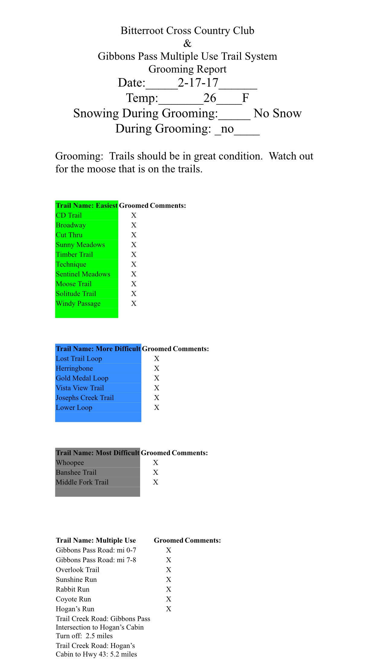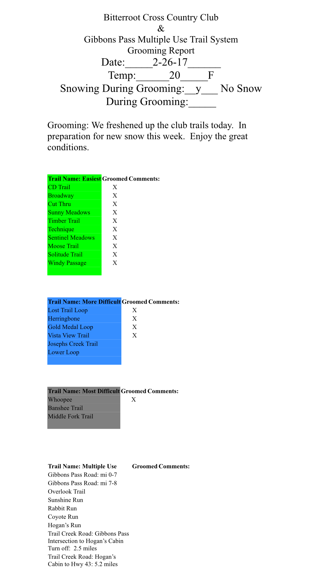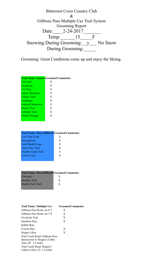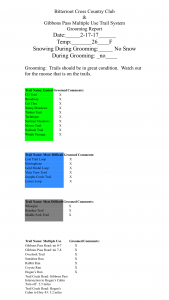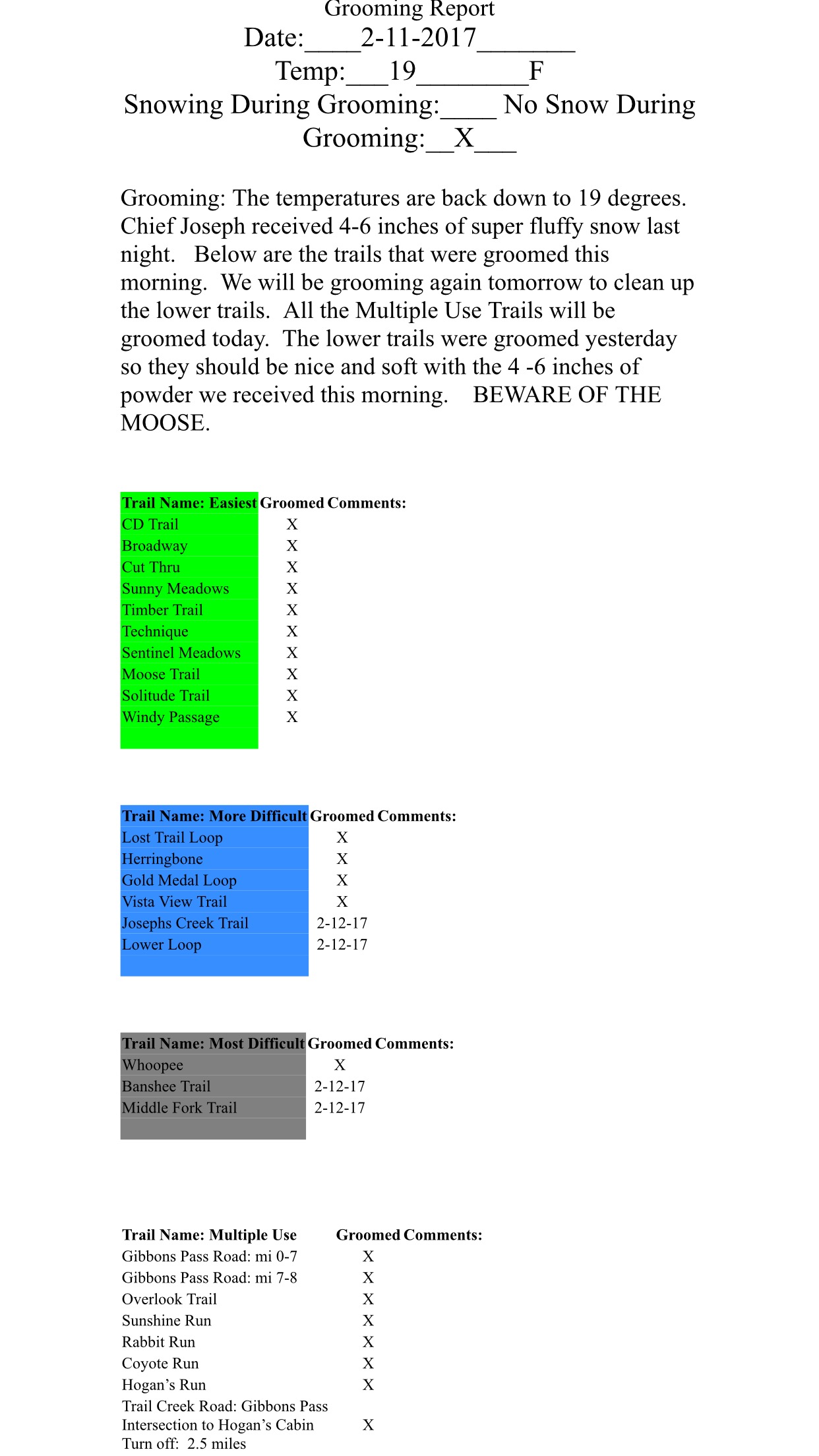 The snowcat that Lost Trail uses to groom the trails at Chief Joe is still down for repair, and will not be fixed by the end of the season. Our volunteer snowmobile grooming crew will be out this Saturday, and plans on grooming once a week through the end of March.