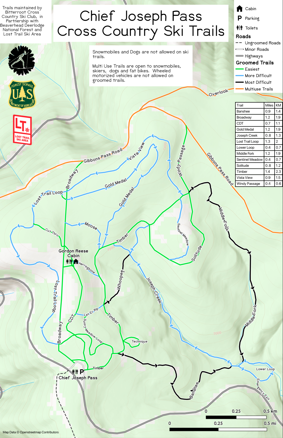 Chief Joseph pass has nearly 20 miles of of multi-use trails. The multi-use trails are appropriate for skate skiing, dog sledding, snow shoeing, fat-tire biking, and snowmobiling. The multi-use trails are generally wider than the ski trails, and do not have tracks set for classic skiing. The multi-use trails can be accessed from the parking area just east of Lost Trail Pass. Dogs are allowed on the Multi-use trails.